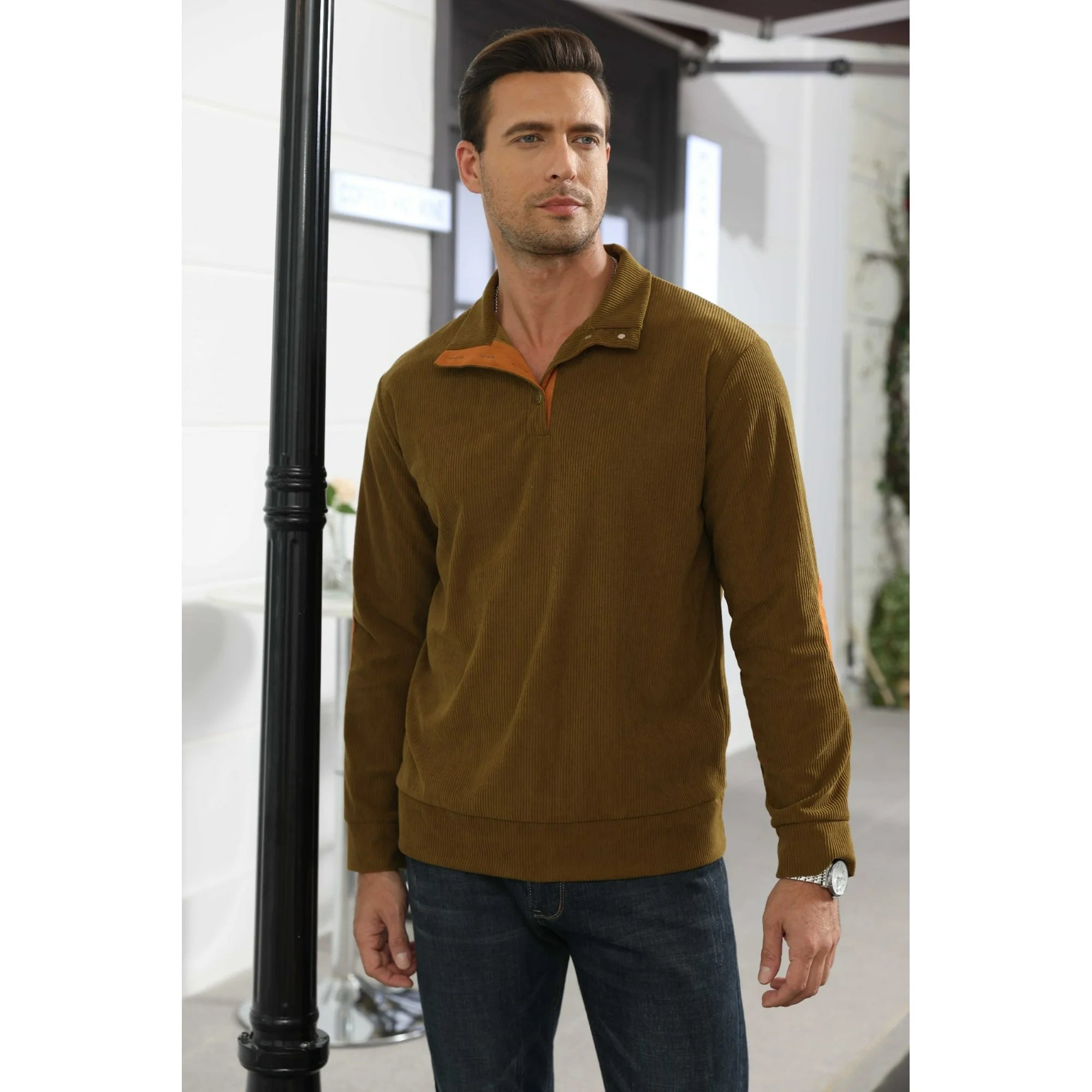 This men's corduroy sweatshirt features advanced warmth and windproof technology, ensuring you stay comfortably shielded in colder climates. The fabric is meticulously engineered to provide exceptional insulation, effectively trapping body heat to keep you warm during brisk winds and chilly temperatures. The windproof design acts as a reliable barrier against biting winds, making it an ideal choice for outdoor activities, morning jogs, or simply navigating your daily routine during colder seasons.